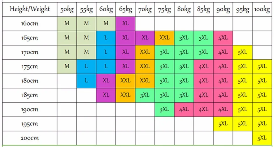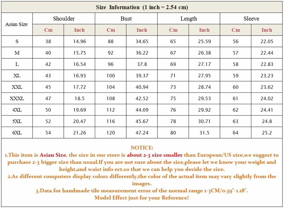 - Asian size :S,M,L,XL,XXL,3XL,4XL,5XL,6XL